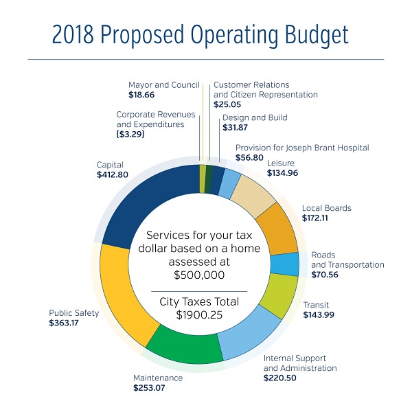 “Despite a number of significant budget pressures like the increase to Ontario’s minimum wage effective Jan. 1, 2018, and funding needed to address operational challenges in transit, Burlington’s proposed operating budget continues to ensure our assets are renewed and maintained in a fiscally responsible manner. Since 2011, overall tax increases in Burlington have averaged 1.9 per cent. In a comparison of property taxes in municipalities in the Great Toronto Hamilton Area, Burlington’s property taxes are the third lowest for a residential single-family detached home.” said Joan Ford, City of Burlington Treasurer and Director of Finance
